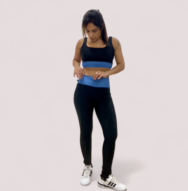 Este conjunto é confeccionado com tecido de malharia de urdume, que se destaca pela elasticidade tridimensional, garantindo um toque suave, brilho elegante e conforto inigualável. O design inovador apresenta um diferencial único: barras coloridas distintas tanto no top quanto na cintura da legging, adicionando um toque de cor vibrante ao conjunto. O acabamento canelado eleva a peça com uma mistura de elegância e modernidade, enriquecendo seu visual e impulsionando sua autoestima tanto durante os exercícios quanto nos momentos de lazer. Prepare-se para se destacar com um look que combina estilo, conforto e funcionalidade.